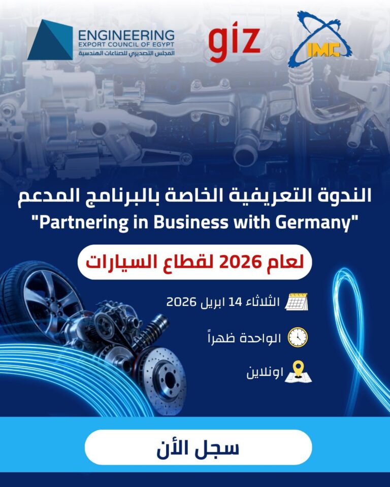 Full 1Market studiesTransform data into information, and information into insightRead moreFull 1 - copyCapacity Building High specialized Workshops in export related topicsRead moreFull 3International CooperationCooperate with international organizations to enhance export capabilitiesRead morefull 4International MarketingTrade Missions , Exhibitions and Buyers MissionsRead more Stay tuned for EXXA 2026 Read More » ندوة بالتعاون مع مركز تحديث الصناعة (IMC) والوكالة الألمانية للتعاون الدولي (GIZ) Read More » “برنامج الشراكة مع ألمانيا” لعام 2026 لقطاع السيارات Read More » ورشة العمل التدريبية بعنوان: “آلية تعديل حدود الكربون (CBAM) وكيفية الامتثال لمتطلباتها” Read More » فرصة مميزة للشركات المصرية للتعاون مع Bosch للاجهزة المنزلية Read More » تأجيل بعثة المشترين الخاصة بمعرض Egypt Power Show لتُعقد خلال الفترة من 6 إلى 8 يوليو Read More » Previous Next EXXA 2025 Engineering Exports Excellence Award Previous Next Egypt Power Show 2024 Growth Beyond Borders International Cooperation International Cooperation Market Studies Market Studies Capacity Building Capacity Building International Maketing International Marketing HATS 2022 E-CATALOGUE Auto Supplies Home Appliances Metal Forming Machinery & Equipment Electrical Supplies Kitchen Supplies View more Sectors & Products
