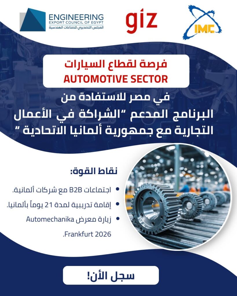 يعلن المجلس التصديري للصناعات الهندسية بالتعاون مع مركز تحديث الصناعة (IMC) و الوكالة الالمانية للتعاون الدولي GIZ عن فتح باب التسجيل في “برنامج الشراكة مع ألمانيا” لعام 2026 لقطاع السيارات