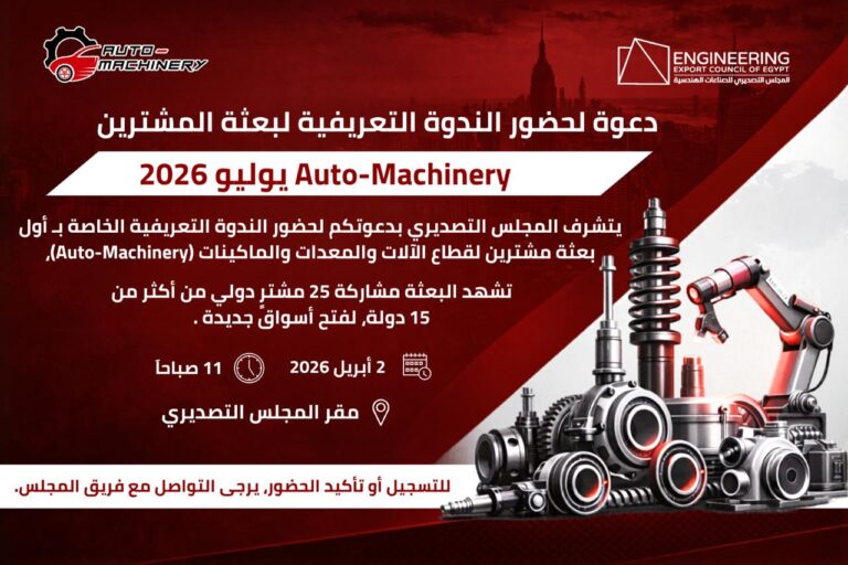 دعوة لحضور الندوة التعريفية – بعثة المشترين Auto-Machinery 2026 يدعوكم المجلس التصديري للصناعات الهندسية لحضور الندوة التعريفية الخاصة بأول بعثة مشترين لقطاع الآلات والمعدات والماكينات،