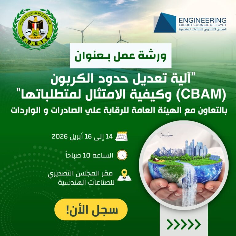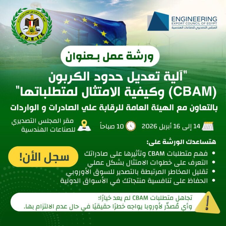 بالتعاون مع الهيئة العامة للرقابة على الصادرات والواردات (GOEIC) يعلن المجلس التصديري للصناعات الهندسية عن تنظيم ورشة عمل تدريبية (تطبيق عملي) بعنوان: “آلية تعديل حدود